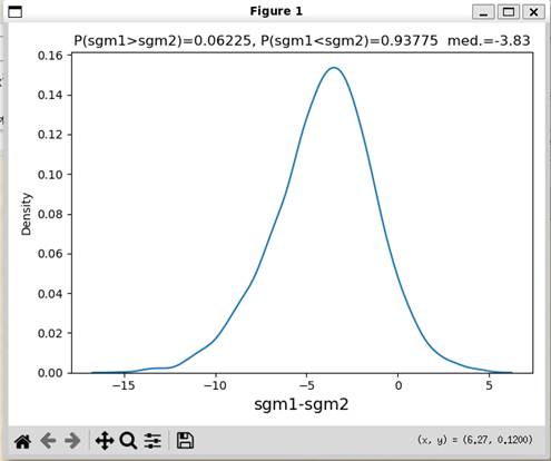 パラメータの差sgm1-sgm2の事後分布と、差sgm1-sgm2の事後分布が正である確率および負である確率が表示されている。正である確率が6%であるので、sgm1の方が小さい傾向にあると言える。