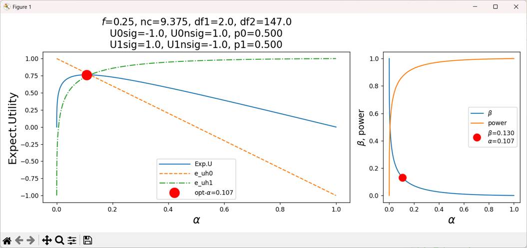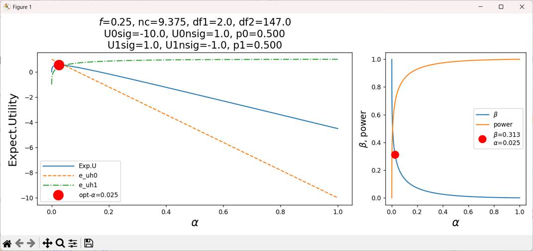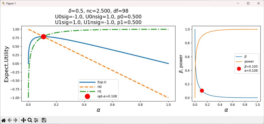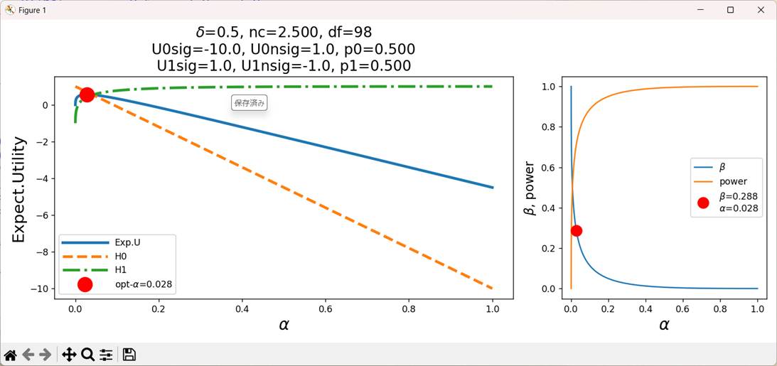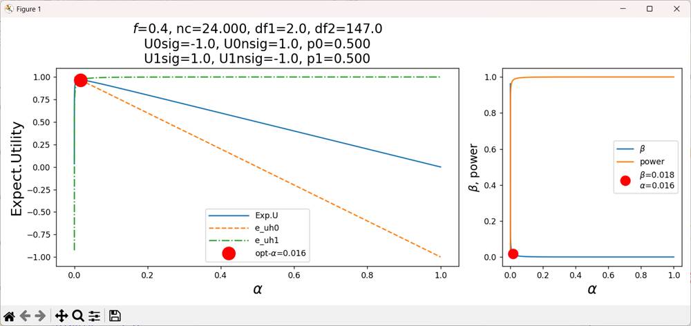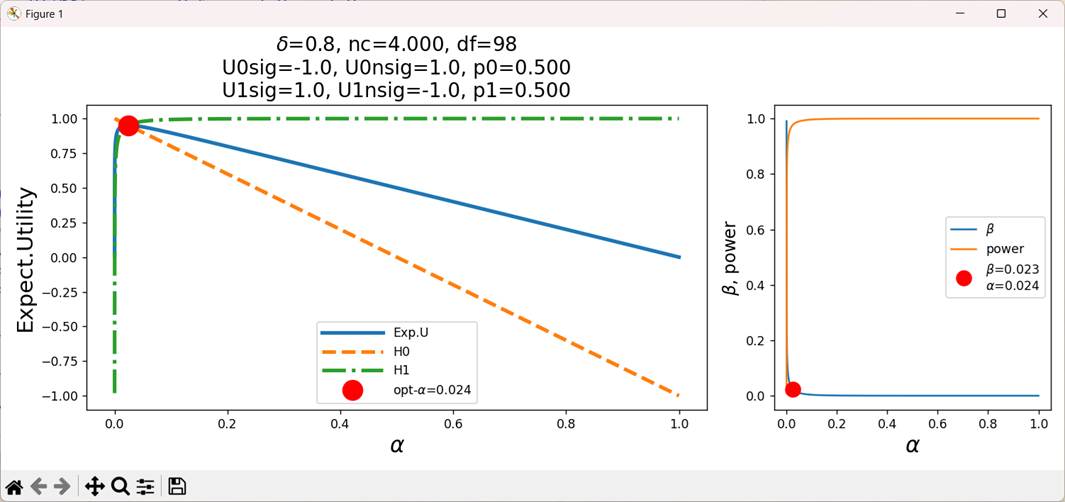 左側のグラフにおいて青の実線が期待効用のグラフである。グラフの最大値の位置(最適な有意水準)が赤丸で示されている。最適な有意水準(opt-α)として2.4%が得られている。