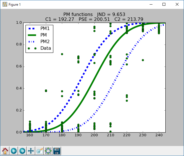 弁別閾・丁度可知差異あるいは主観的等価点は、理論的には心理測定関数(psychometric function: PF)により与えられる(岡本、2025)。