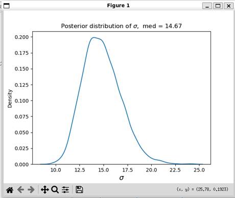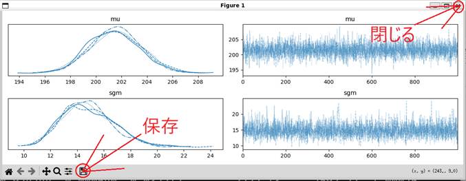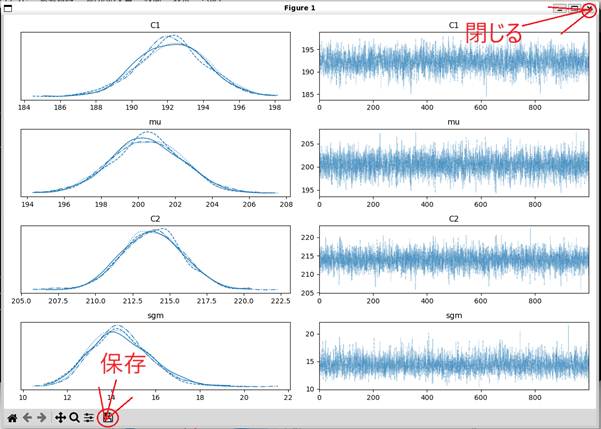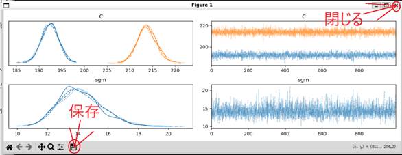 上の例では、Results.txtが設定されている。出力ファイル名を設定すると、入力データファイルが読み込まれ、Stanスクリプトがコンパイルされる。コンパイルには多少時間が掛かる。コンパイルが終了すると、MCMCサンプリングが始まる。MCMCサンプリングが終了すると、まずトレース図(図A2)が表示される。