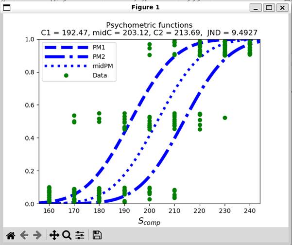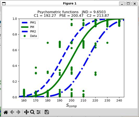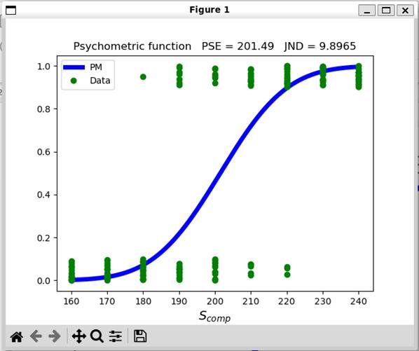弁別閾・丁度可知差異あるいは主観的等価点は、理論的には心理測定関数(psychometric function: PF)により与えられる(岡本、2025)。