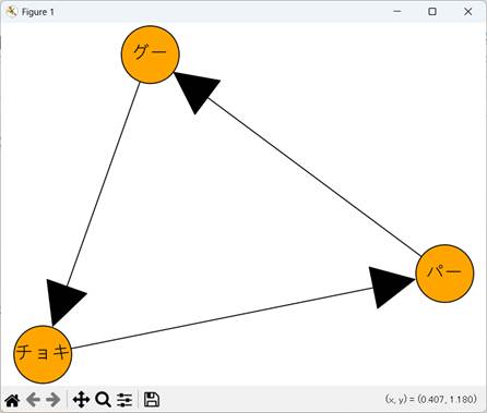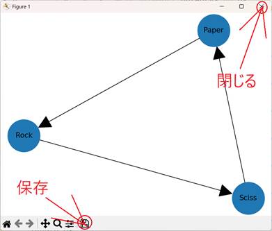 リストA.1 グー・チョキ。パーの関係を表す有向グラフの描画スクリプト(rock_paper_scissors.py)