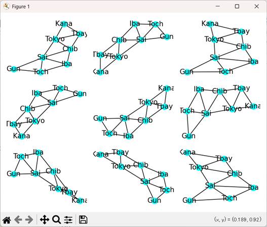 9枚のグラフが描かれている。隣接関係の2次元上の表示には、自由度があるので、適切なものを選ぶ必要がある。