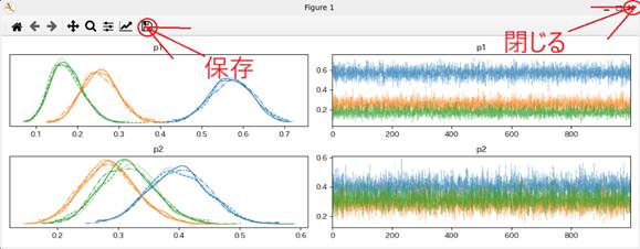 左に事後分布のグラフ、右にサンプリングのトレース図が表示されている。
