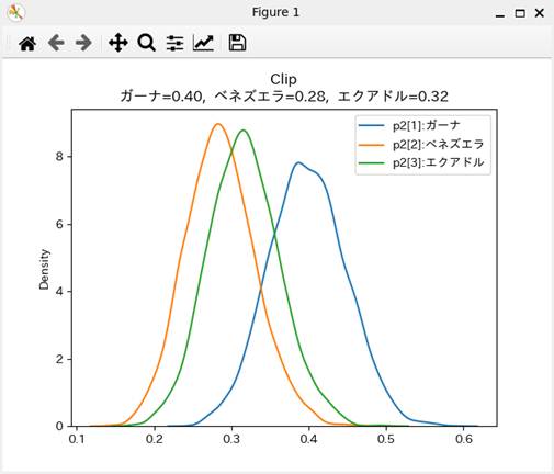 「ノーズクリップなし」条件での3つのチョコレートの選好確率の事後分布のグラフが表示されている。ガーナが他の2つより好まれていることが明瞭に示されている。