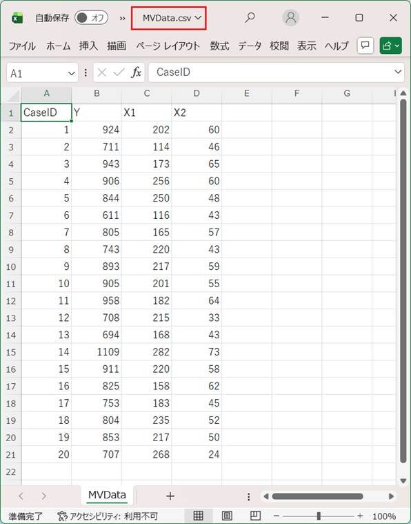 リスト1のスクリプトファイル(mv_regress.stan)、リスト2のスクリプトファイル(MRegress.py)、および入力デーらファイル(例えば図1のファイルMVData.csv)を同じフォルダに置く。そのフォルダにカレントディレクトリ(フォルダ)を移し、CmdStanPyのインストールされた環境で次のコマンドを実行する。