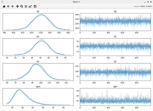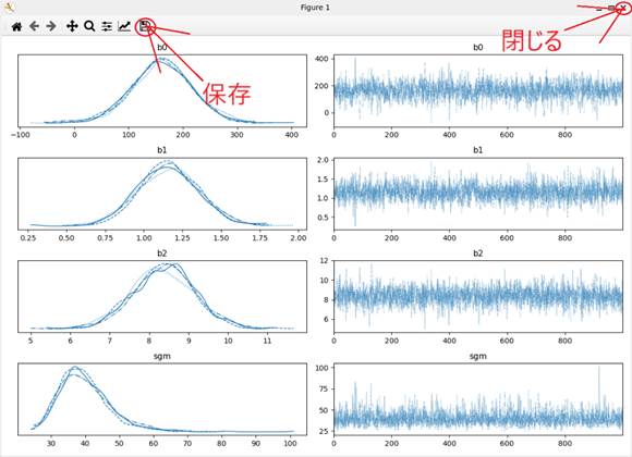 上のコマンドを実行すると、ファイルが読み込まれ、Stanスクリプトのコンパイルが始まる。コンパイル後、MCMCサンプリングが行われ、サンプリング後、トレース図が表示される(図7)。