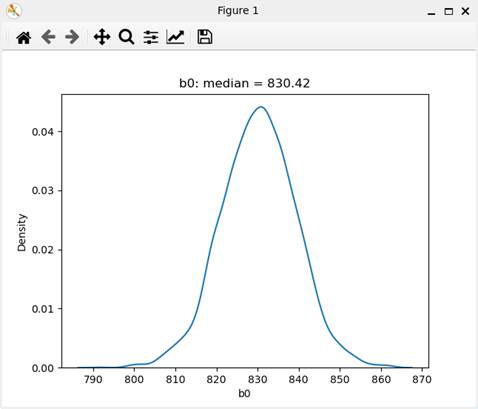 定数項b0の事後分布のグラフである。定数項b0は、中心化された独立変数に対するものであるので、中心化される前の独立変数の平均値における回帰平面の値である。