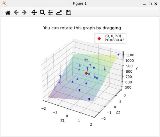 が、データの独立変数Z1,Z2の平均値0に対応する位置の重回帰平面の値であるので、データ全体の中央に位置している。独立変数Z1、Z2の変域も標準化されているので同じ範囲であるといえる。