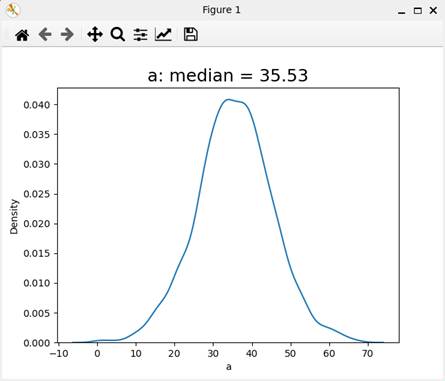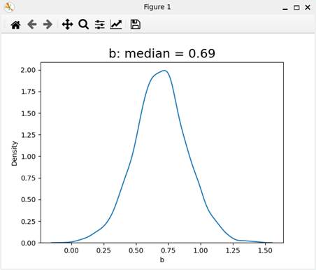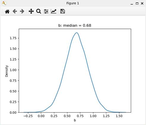 パラメータaの事後分布のグラフである。点推定値として中央値が示されている。Gelmanら(2021)は、点推定値として、平均値より安定した中央値を勧めている。独立変数が中心化されているので、パラメータaは元のデータXの平均値における回帰直線の値である。