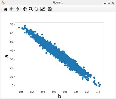 パラメータaとbの散布図である。中心化の効果としてパラメータの相関が消えている。