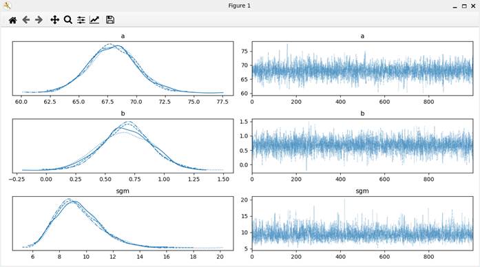 上のコマンドを実行すると、Stanスクリプトファイルが読み込まれてコンパイルが始まる。コンパイルは多少時間が掛かる。コンパイルが終了すると、MCMCサンプリングが始まり、終了するとトレース図が表示される(図2)。