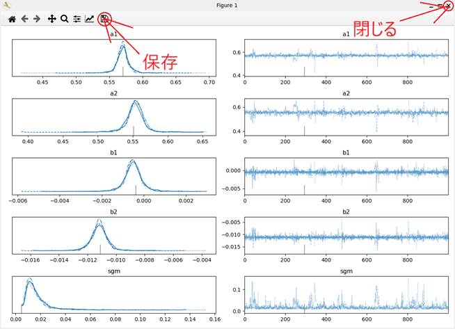 左側に事後分布のグラフ、右側にサンプリングのトレース図が表示されている。