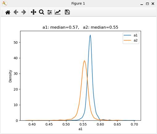 plt.title('a1: median={0:.2f}, a2: median={1:.2f}'.format(