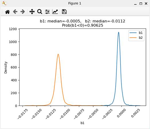 b1_hat, b2_hat) + '\n' + f'Prob(b1<0)={np.mean(fit["b1"]<0)}')