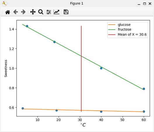フラクトースとグルコースの甘味度の温度に対する回帰直線である。中央の赤の垂直線は、温度データの平均値の位置を表している。この測定温度の平均値においてフラクトースの方が甘味度が高いことは、図4のグラフに対応している。温度による甘味度の減少がフラクトース方が急であることは、図5のグラフに対応している。