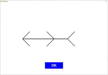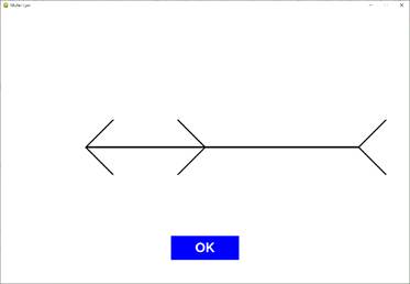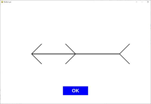 実験のためのプログラムは、リストE1に示すものである。観察者は、図E1のような刺激図形が提示されたとき、左右の矢軸が同じ長さに見えるように調整することが求められる(調整法)。矢軸はキーボードの右矢印→キーを押すと長くなり左矢印キー←を押すと短くなる。左右の矢軸が同じ長さに見えたところで「OK」ボタンをクリックする。「OK」ボタンをクリックすると、少しの時間の後、次の刺激図形が提示されるので、左右が同じ長さに見るように調整して「OK」ボタンをクリックする。この試行を20試行繰り返して実験終了である。