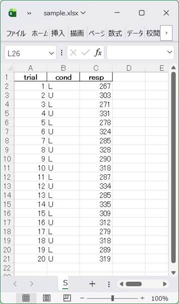 リストE2のプログラムを実行すると、入力ファイル名を聞いてくるので、表示したいデータファイル名を設定する。次の例では、上の実験で保存したファイルsample.xlsxが設定されている。