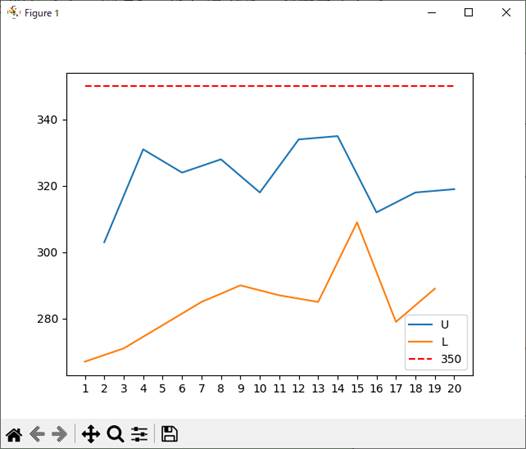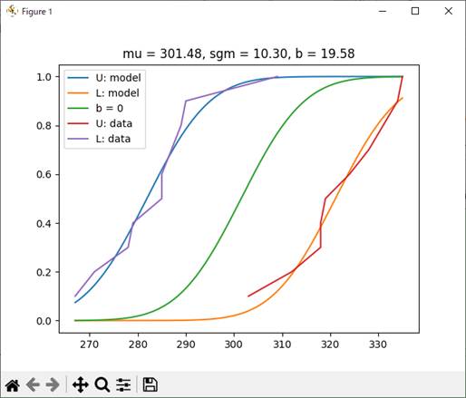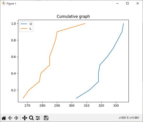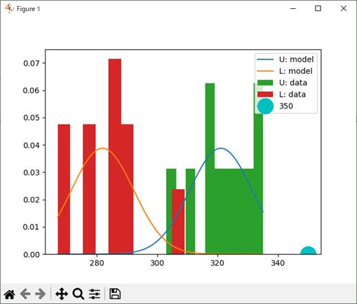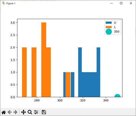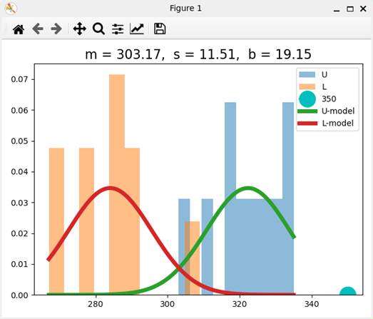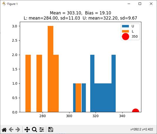 図E2において、U条件およびL条件の平均値と標準偏差がグラフ上部2行目に表示されている。表示1行目に示されている平均値は、U条件の平均値とL条件の平均値の2つの平均値の平均値である。バイアスはこの平均値とU条件における平均値との差である。