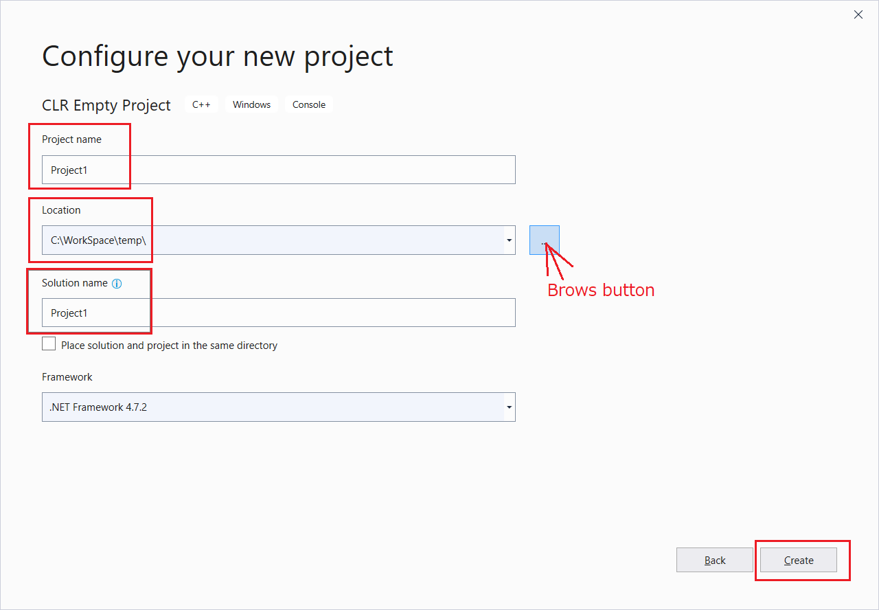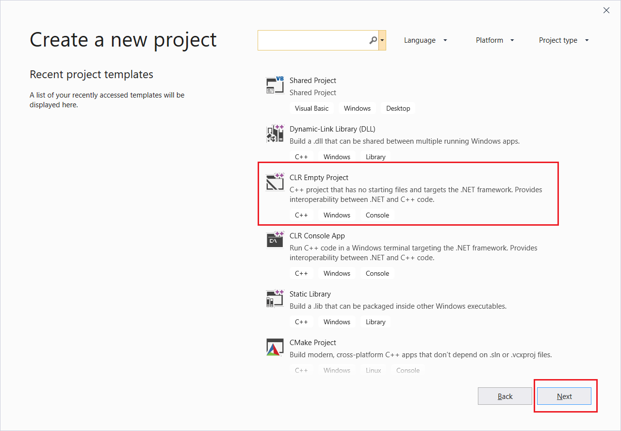 2). Select the template gVisual C++|CLR|CLR Empty Projecth.