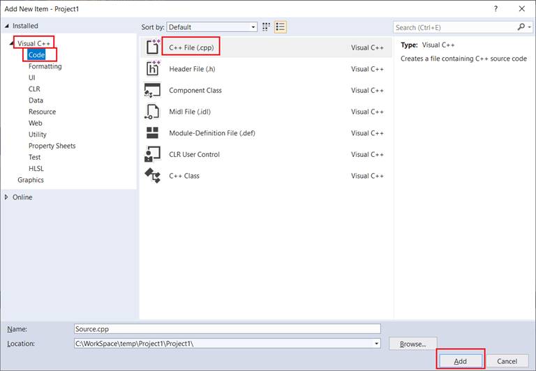 Choose the template gVisual C++|Code|C++ File (.cpp)h, then click