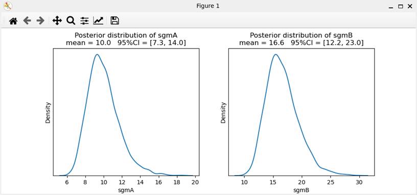 標準偏差sgmAとsgmBの事後分布が描かれている。