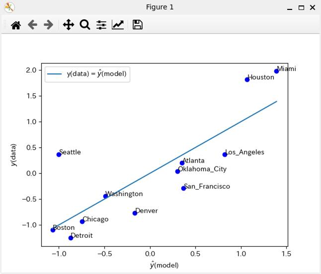 リスト1のStanスクリプトのファイル(MLReg.stan)、リスト2のPythonスクリプトのファイル(MLRegr.py)、および入力データファイル(予想最高気温.xlsx)を同じフォルダに置く。そのフォルダに、カレントディレクトリ(フォルダ)を移し、CmdStanPyのインストールされた環境において、次のコマンドを実行する。CmdStanPyの簡単な解説を、このウェブサイトに用意した。